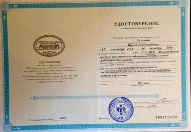 Удостоверение о повышении квалификации в ГАОУ НСО "Новосибирский институт повышения квалификации и переподготовки работников образования" по теме "Коррекционная направленность воспитательной работы с дошкольниками, имеющими речевые нарушения" 108ч. 17.09-06.10.2018