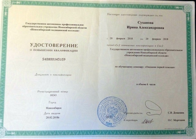 Удостоверение о повышении квалификации в Государственном автономном профессиональнгом образовательном учреждении Новосибирской области "Новосибирский медицинский колледж" по обучающему семинару: "Оказание первой помощи" (6ч) 20.02.18