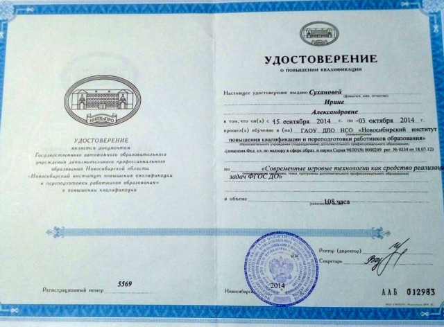 Удостоверение о повышении квалификации в ГАОУ НСО "Новосибирский институт повышения квалификации и переподготовки работников образования" по теме "Современные игровые технологии как средство реализации задач ФГОС ДО" 108ч. 15.09-03.10.2014