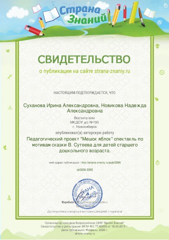за публикацию педагогического проекта "Мешок яблок" спектакль по мотивам сказки В. Сутеева |
